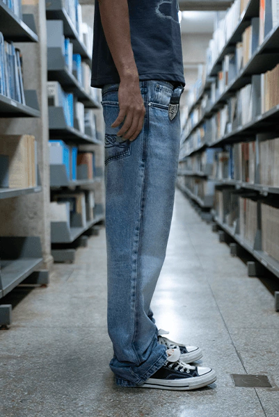 A peça parte de uma base bootcut clássica, reinterpretada com ajuste mais solto no quadril da coxa, mantendo conforto sem recorrer ao volume exagerado das modelagens baggy. O fite segue uma linha reta com leve amplitude até o joelho, onde a abertura da barra se expande sutilmente, criando um flare discreto e contemporâneo.